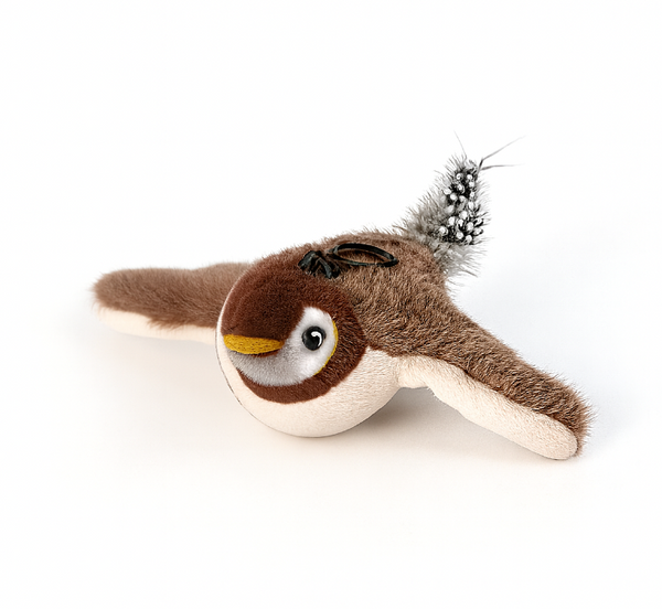 Der tanzende Spatz besteht aus weichen Materialien und hat ein austauschbares Design. So ist das Spielzeug sicher für Katzen und bietet endlosen Spielspaß.